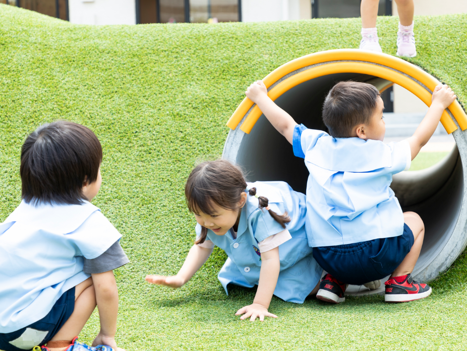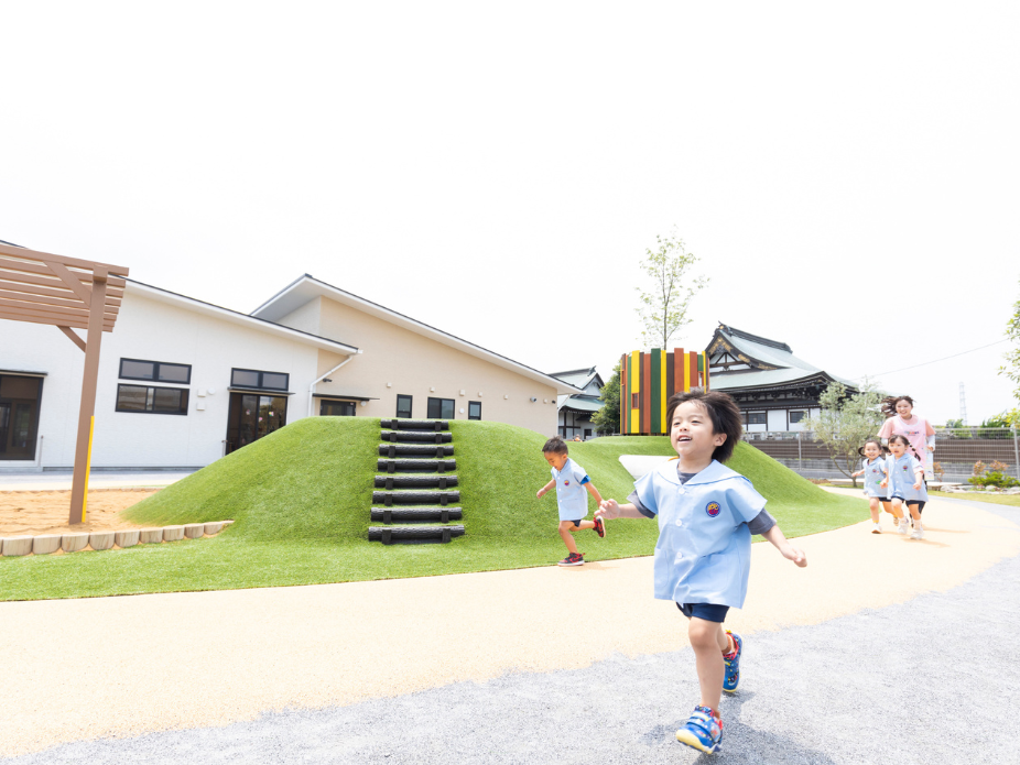 そんな大切な時期だからこそ、自然とのふれあいや、水遊びやどろんこ遊び、絵本、本格的な体操指導、音楽などいろいろな教育をしています。夢と想像力を膨らませる総合遊具「プレイワールド」は、子ども達のお気に入り!是非見に来てくださいね。